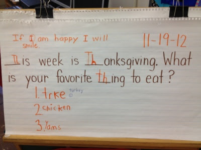 I have always loved morning messages. This week we got really into making lists of our favorite Thanksgiving foods. I shared the pen and had students come up to the front and help me sound words out. We are also still working on mastering that /th/ digraph.